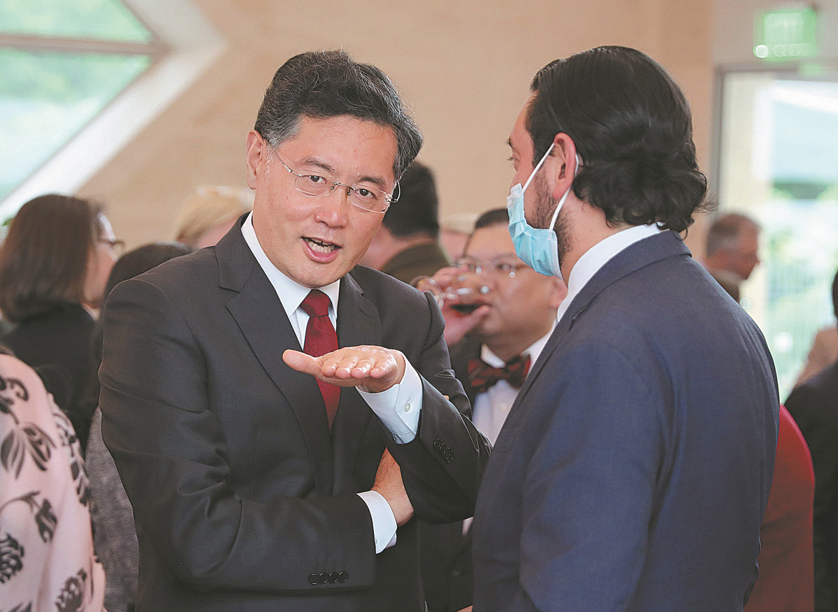 Chinese Ambassador to the United States Qin Gang (left) talks with Daniel Legarda, vice-minister of foreign trade of Ecuador, at a reception at the Chinese embassy in Washington on Tuesday evening marking the 95th anniversary of the founding of China's People's Liberation Army. ZHAO HUANXIN/CHINA DAILY