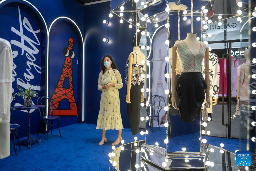 A visitor views exhibits at the booth of Galeries Lafayette in the French pavilion at the second China International Consumer Products Expo (CICPE) in Haikou, south China's Hainan Province, July 26, 2022. There are about 50 French companies and nearly 250 French brands participating in the expo being held on the resort island of Hainan. France is the guest of honor country at this year's CICPE and, besides China, the largest exhibitor. (Xinhua/Hu Zhixuan)