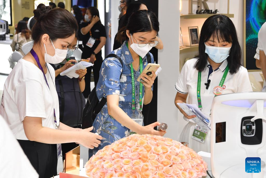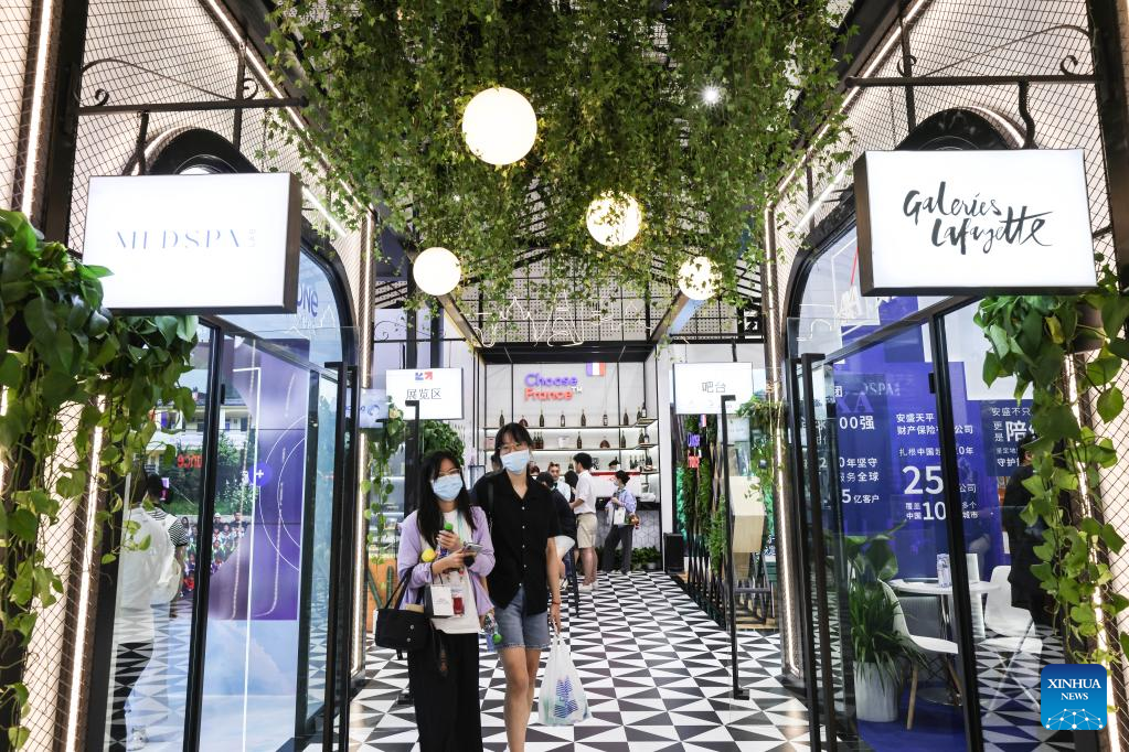 Visitors view exhibits in the French pavilion at the second China International Consumer Products Expo (CICPE) in Haikou, south China's Hainan Province, July 27, 2022. There are about 50 French companies and nearly 250 French brands participating in the expo being held on the resort island of Hainan. France is the guest of honor country at this year's CICPE and, besides China, the largest exhibitor. (Xinhua/Zhang Liyun)