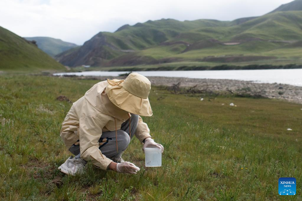 Fan Yadong, a member of a scientific expedition team, collects insect samples from a source of the Yangtze River in northwest China's Qinghai Province, July 26, 2022. Chinese scientists launched an expedition on Sunday in the headwater regions of the Yangtze and Lancang rivers in northwest China's Qinghai Province, to investigate the regions' water resources and ecological environment.