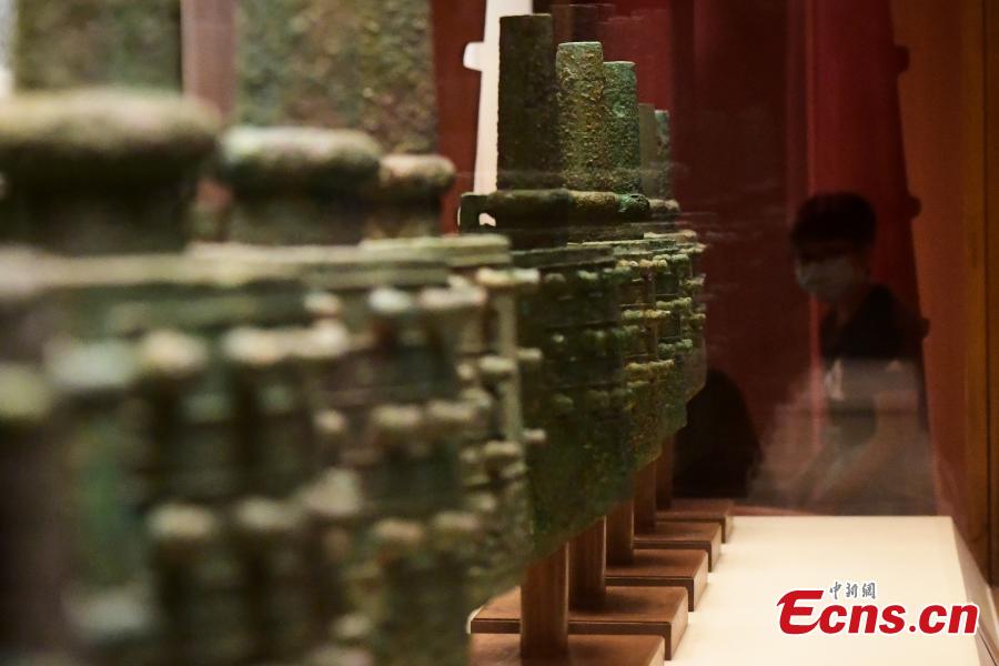 Photo taken on July 27, 2022 shows chime bells, an ancient Chinese musical instrument consisting of a set of bronze bells, on display at the National Museum of China, Beijing, July 27, 2022. (Photo: China News Service/Tian Yuhao)