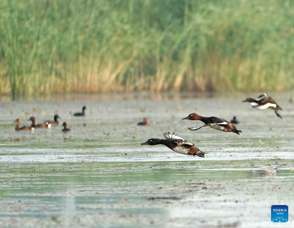 Photo taken on July 22, 2022 shows Baer's pochards and white-eyed pochards in Baiyangdian Lake in Xiongan New Area, north China's Hebei Province. Baiyangdian Lake, the largest wetland ecosystem in northern China, has seen significant improvement in its water quality thanks to environmental protection and restoration efforts in recent years. (Xinhua/Xing Guangli)