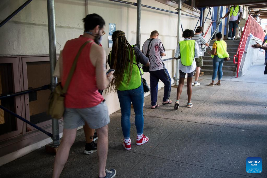 People wait in line at a monkeypox vaccination site in the Brooklyn borough of New York, the United States, on July 30, 2022. New York Governor Kathy Hochul declared a state disaster emergency late Friday night due to the growing monkeypox cases in the state. (Photo by Michael Nagle/Xinhua)