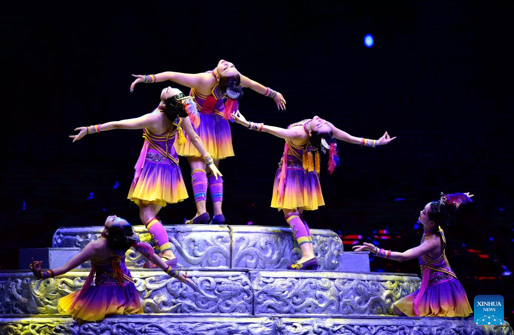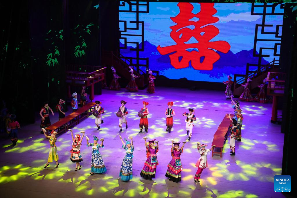 Actors perform in the show "Colorful Guizhou Style" at Guiyang Grand Theatre in Guiyang, southwest China's Guizhou Province, July 30, 2022. Performance of the song and dance show "Colorful Guizhou Style" has recently resumed at Guiyang Grand Theatre.