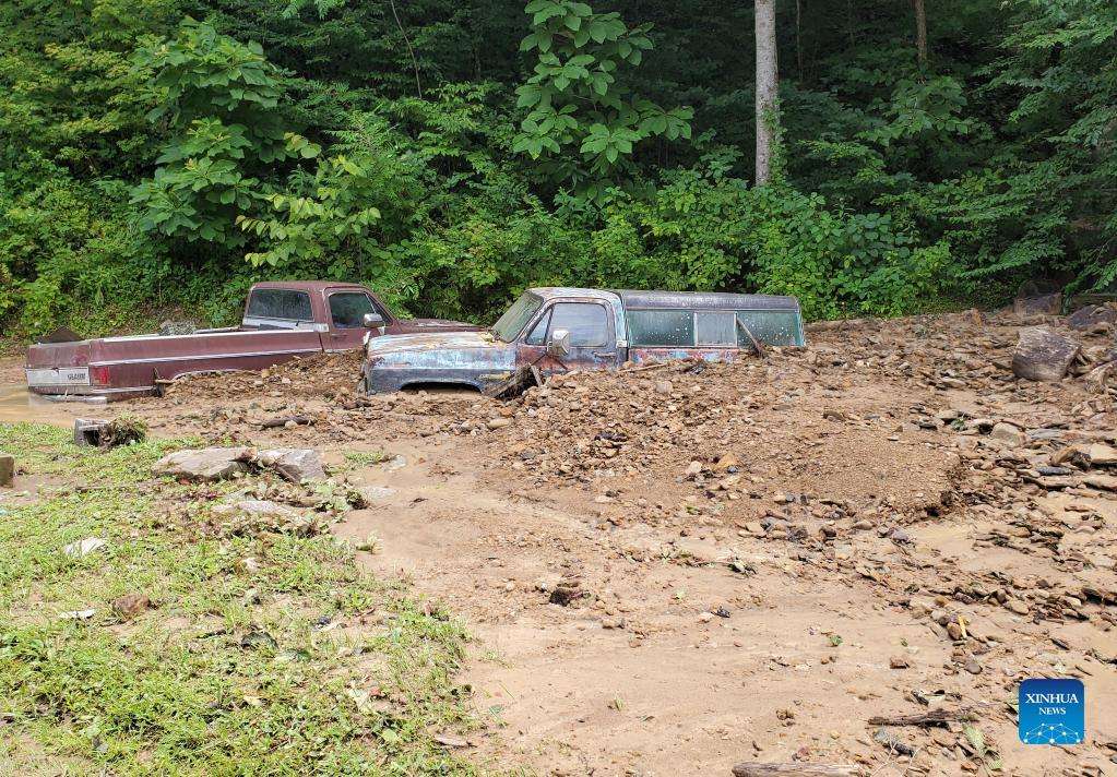 Photo taken on July 30, 2022 shows vehicles destroyed by heavy rain-caused flooding in Central Appalachia in Kentucky, the United States. The death toll from the heavy rain-caused flooding hitting eastern Kentucky rose to at least 25, including four children from one family, Kentucky Governor Andy Beshear confirmed Saturday. (Photo by Wang Changzheng/Xinhua)