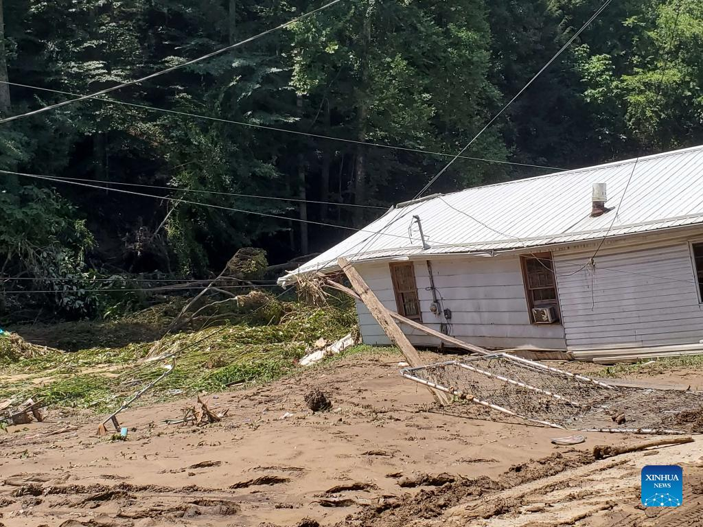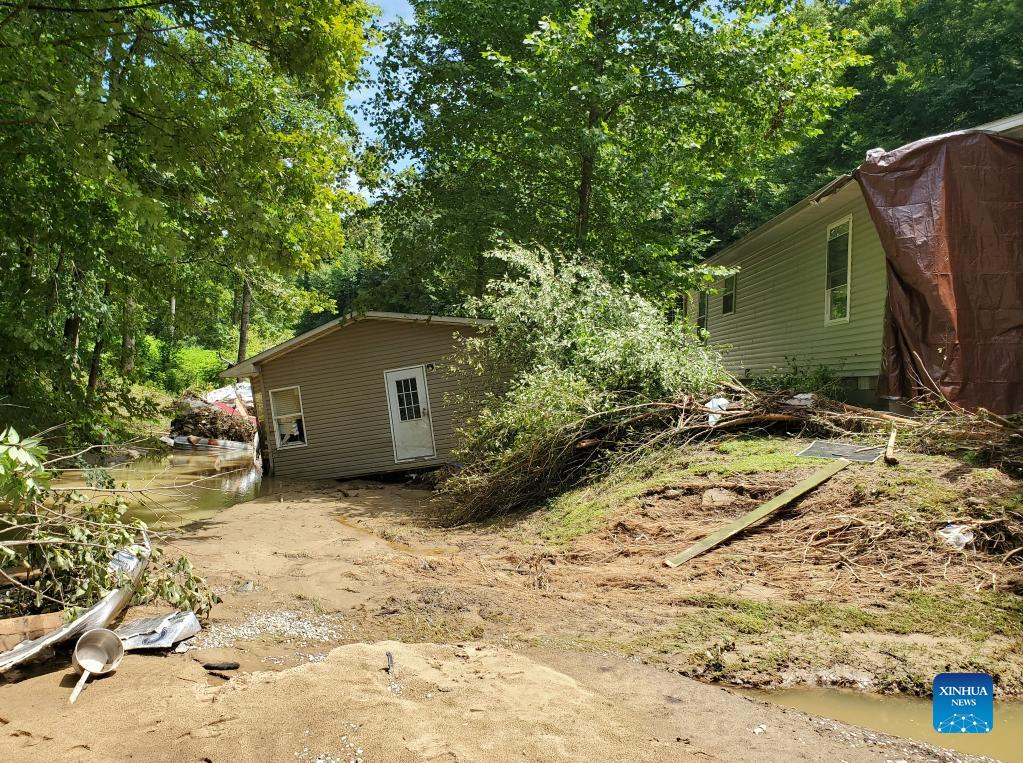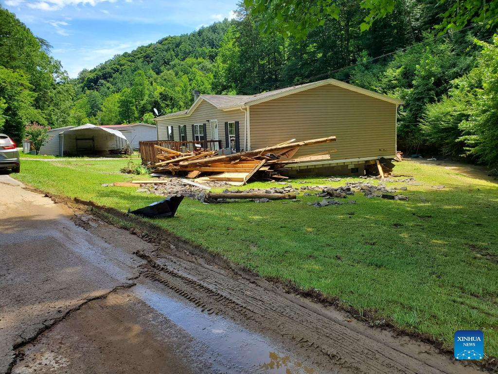 Photo taken on July 30, 2022 shows a house destroyed by heavy rain-caused flooding in Central Appalachia in Kentucky, the United States. The death toll from the heavy rain-caused flooding hitting eastern Kentucky rose to at least 25, including four children from one family, Kentucky Governor Andy Beshear confirmed Saturday. (Photo by Wang Changzheng/Xinhua)