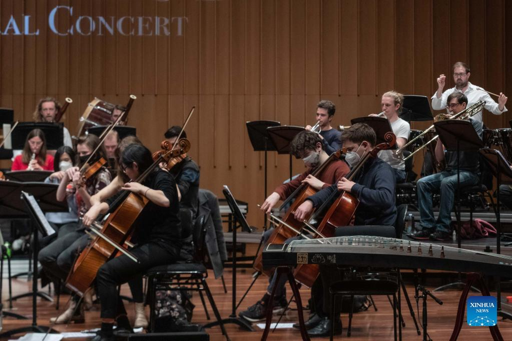 Photo taken on July 30, 2022 shows the opening performance of "Jasmine Flower" by Australian conductor Guy Noble at the "East Meets West" orchestral concert in Llewellyn Hall at the Australian National University in Canberra, Australia. "East Meets West" orchestral concert tour in Australia was held in Canberra on Saturday night. (Photo by Chu Chen/Xinhua)
