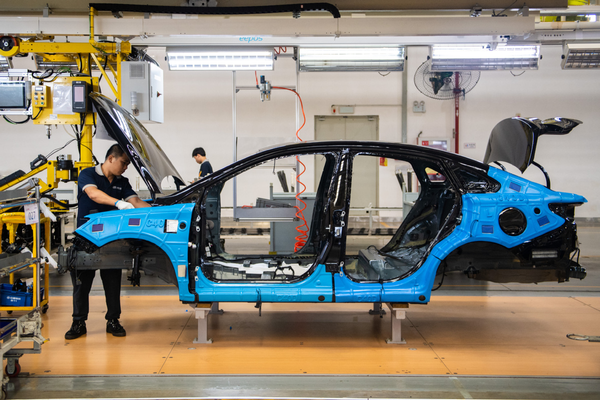 Employees work on an assembly line of BAIC's Zhuzhou factory in Hunan province, July 21, 2022. [Photo/Xinhua]