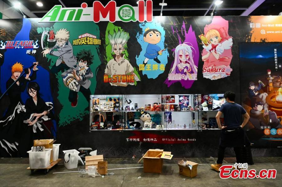 Staff members prepare for the opening of 23rd Animation-Comic-Game Hong Kong at the Hong Kong Convention and Exhibition Center, the Hong Kong Special Administrative Region, July 28, 2022. (Photo: China News Service/Li Zhihua)