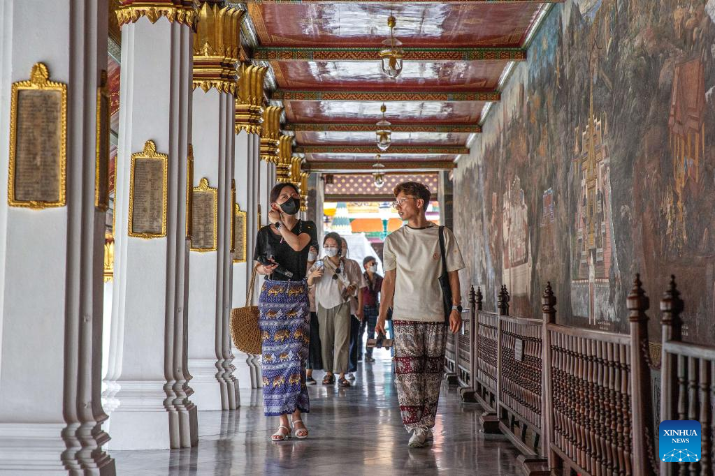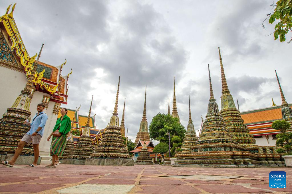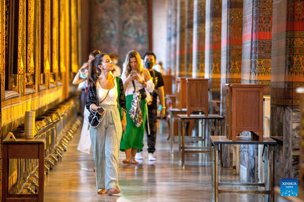 Tourists are seen at the Wat Pho temple in Bangkok, Thailand, on July 31, 2022. Thailand received more than 2 million foreign tourists in the first half of 2022. According to the forecast of the Ministry of Tourism and Sports, the number of tourists is expected to reach 9 million in this year. (Xinhua/Wang Teng)