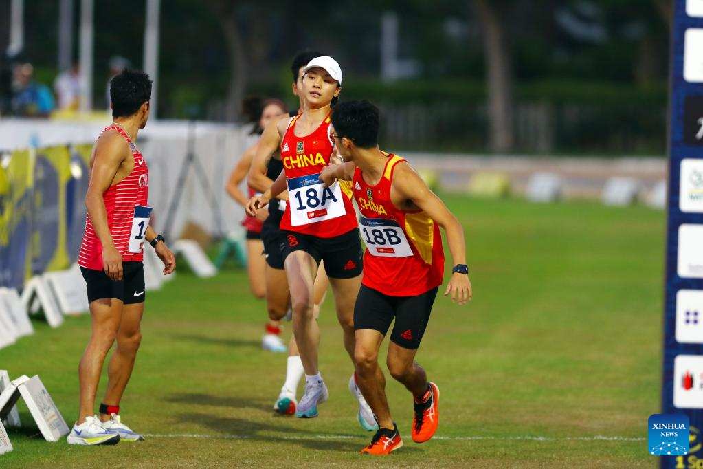 Xie Linzhi (2nd R) and Li Shuhuan (1st R) of China compete in the laser run of the team-relay mix at the UIPM 2022 Pentathlon World Championships in Alexandria, Egypt, July 31, 2022. (Xinhua/Ahmed Gomaa)