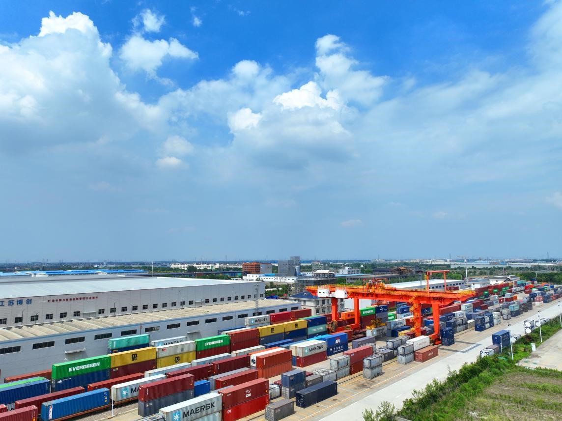 Containers are loaded onto an international rail-sea freight train and a China-Europe freight train (Hai'an-ASEAN) at a railway logistics base in Hai'an, east China's Jiangsu province, June 22, 2022. (People's Daily Online/Xu Cong Jun)