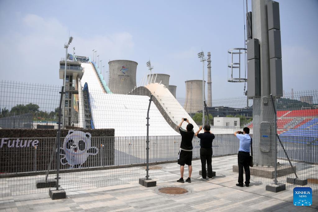 Journalists visit the Big Air Shougang in Shougang Park in Beijing, capital of China, Aug. 1, 2022. The 2022 China International Fair for Trade in Services (CIFTIS) will be held in Shougang Park and the China National Convention Center in Beijing from Aug. 31 to Sept. 5. (Xinhua/Ren Chao)