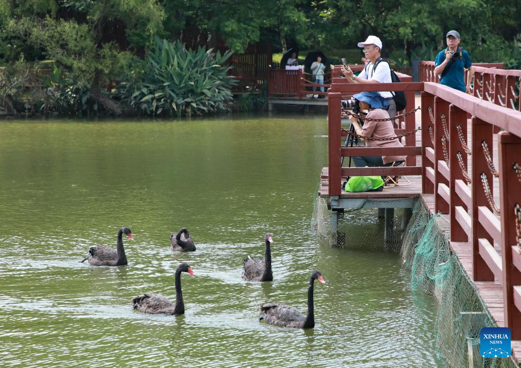 Tourists view black swans in the Guanshan Lake Park in Guiyang City, southwest China's Guizhou Province, Aug. 1, 2022. (Xinhua/Liu Xu)