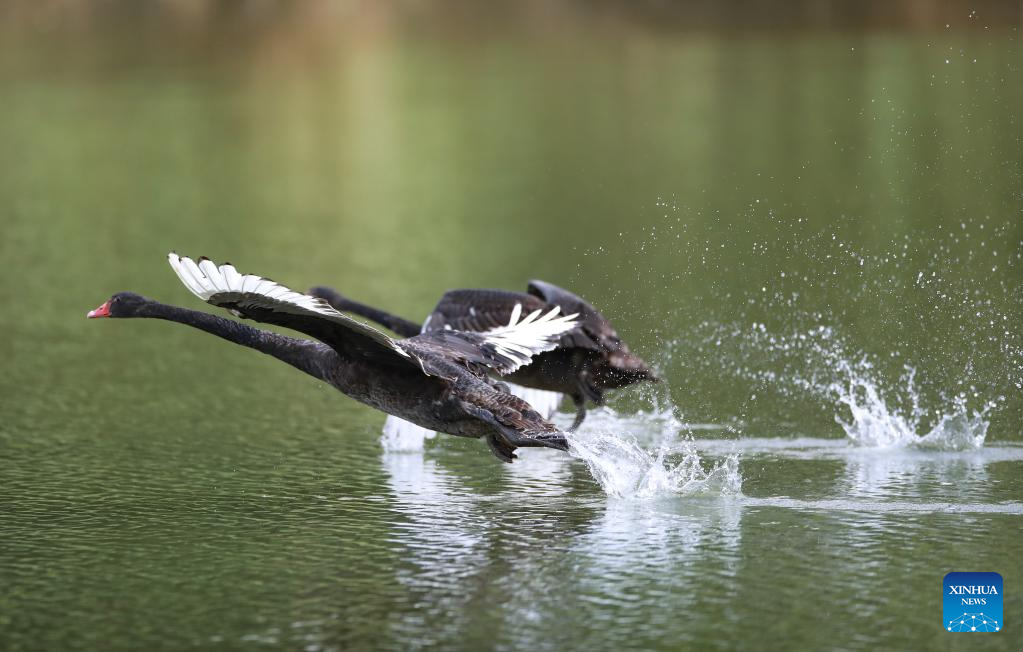 Black swans are seen in the Guanshan Lake Park in Guiyang City, southwest China's Guizhou Province, Aug. 1, 2022. (Xinhua/Liu Xu)