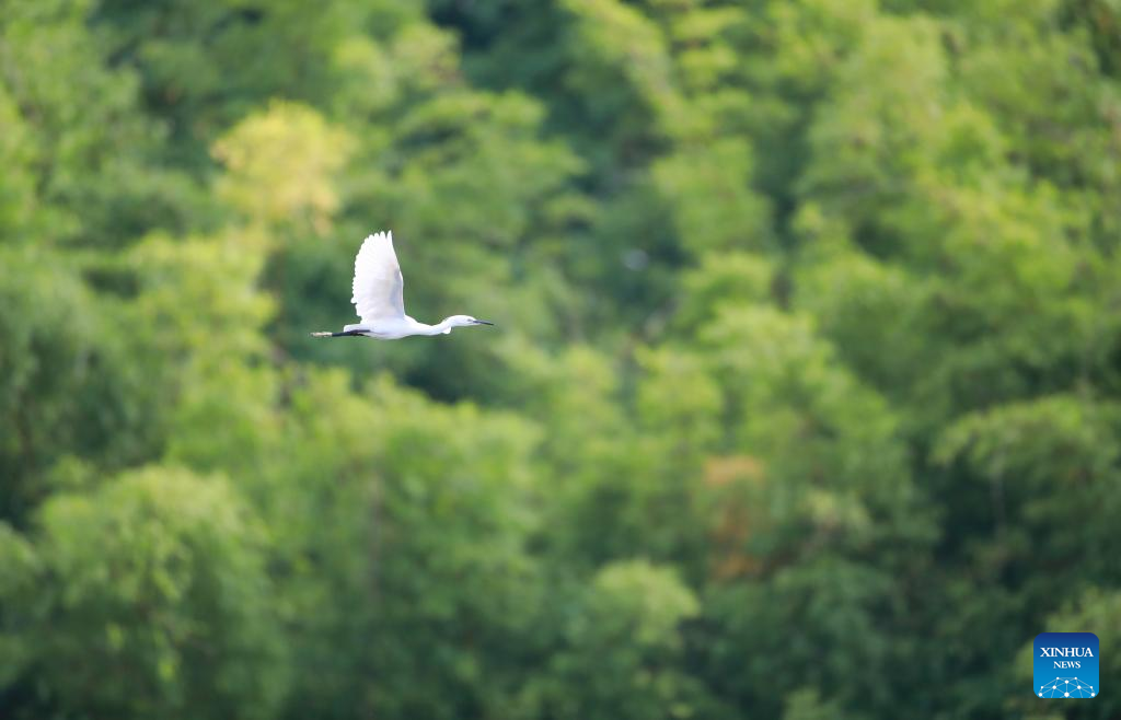 An egret flies over the Guanshan Lake Park in Guiyang City, southwest China's Guizhou Province, Aug. 1, 2022. (Xinhua/Liu Xu)