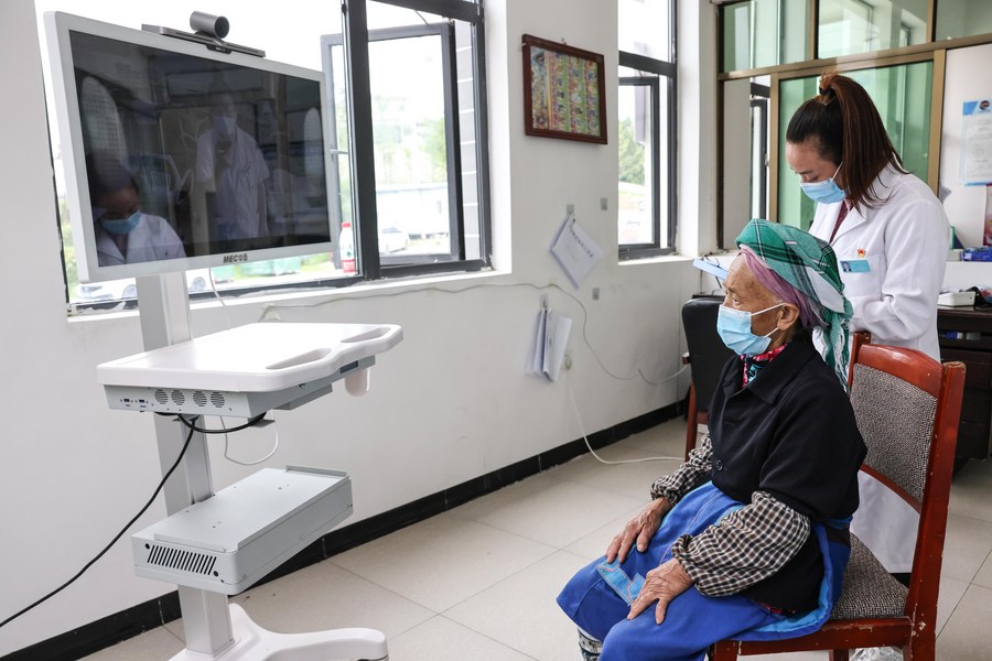 Doctor Chen Li (R) helps villager Chen Zhizhen use a remote consultation system at a clinic in Tuanjie Village, Longshan Township of Longli County, southwest China's Guizhou Province, June 7, 2022. (Xinhua/Ou Dongqu)