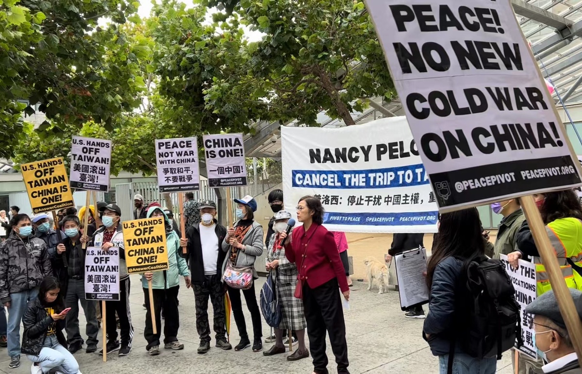 "China is not an existential threat. What is an existential threat is racism and American policy that drives us to war. … The Cold War tactics and agenda by leaders, particularly Pelosi, are unwarranted," said Julie Tang, co-founder of Pivot to Peace and a retired Superior Court judge in San Francisco, at the rally outside Pelosi's local district office.
