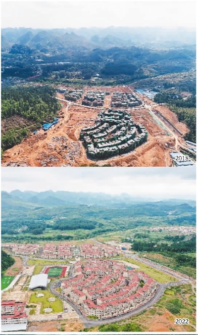 This combo photo shows a relocation site in Kedu township of Pingtang county, southwest China’s Guizhou Province on March 29, 2018 (top) and July 19, 2022 (bottom), respectively. (Xinhua/Ou Dongqu)