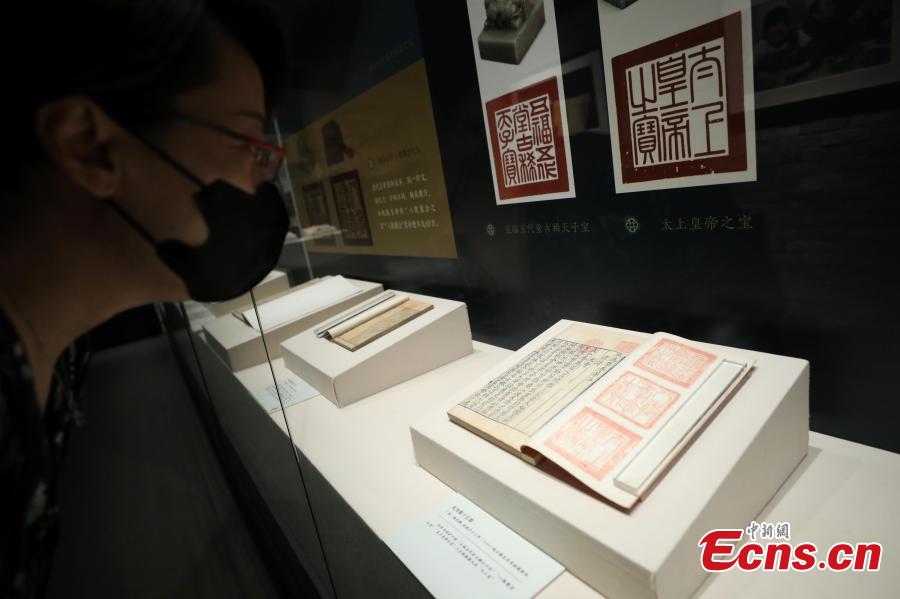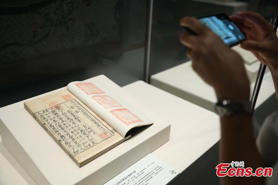 Books in the Tianlu Linlang collection are displayed during a preview of the exhibition "Tianlu Linlang", a precious literary collection, at the National Library of China, Aug. 3, 2022. (Photo: China News Service/Jiang Qiming)