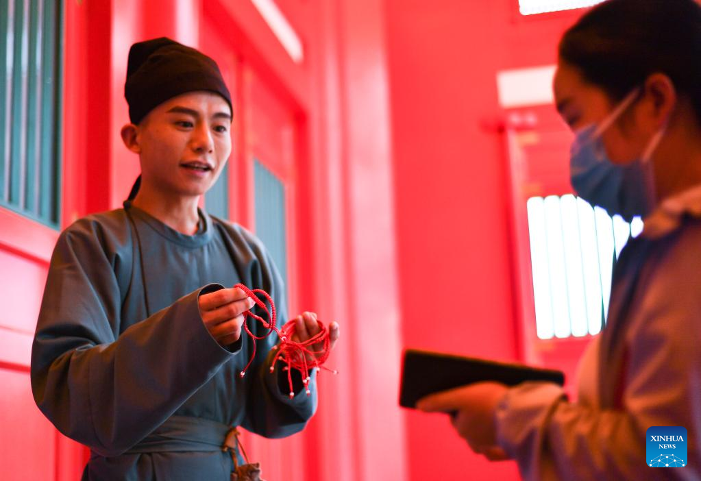 A performer distributes red ropes to tourists on the occasion of Qixi Festival in Qujiang New District in Xi'an, northwest China's Shaanxi Province, Aug. 4, 2022. The Qixi Festival, or Chinese Valentine's Day, falls on Aug. 4 this year. (Xinhua/Zhang Bowen)