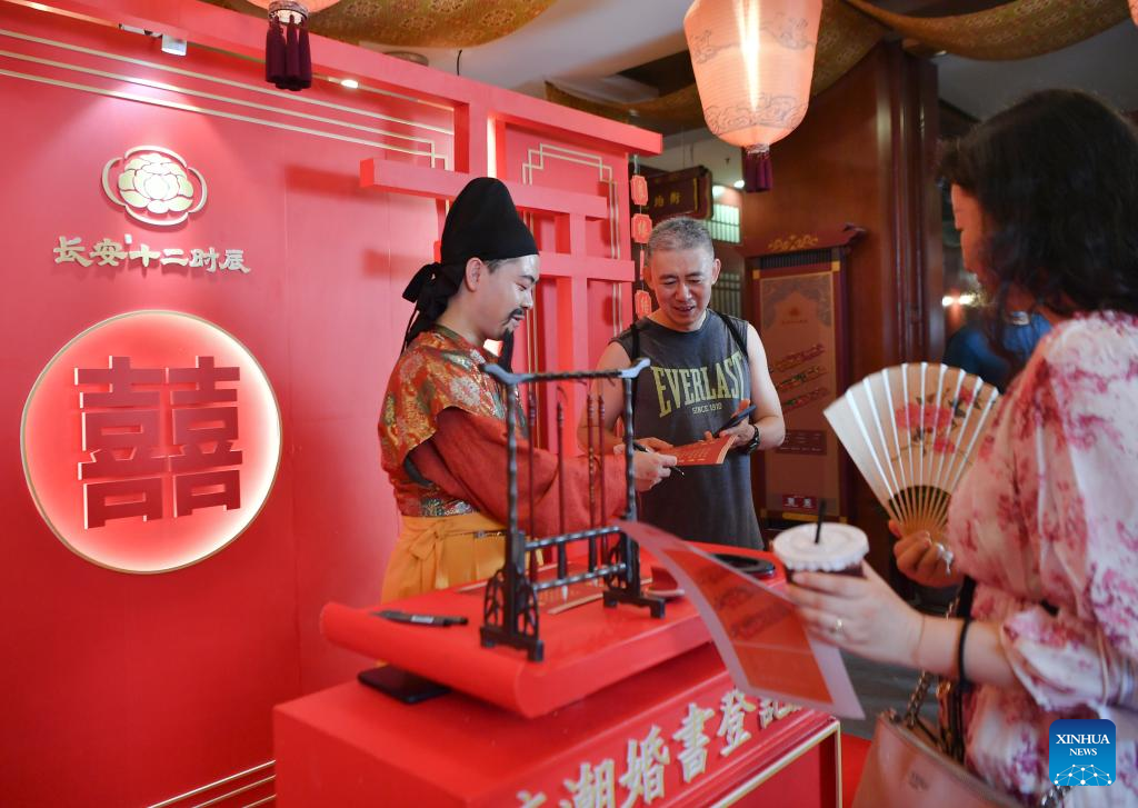 A performer gives a "marriage certificate" to a tourist on the occasion of Qixi Festival in Qujiang New District in Xi'an, northwest China's Shaanxi Province, Aug. 4, 2022. The Qixi Festival, or Chinese Valentine's Day, falls on Aug. 4 this year. (Xinhua/Zhang Bowen)