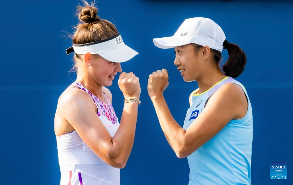 Zhang Shuai (R)/Veronika Kudermetova compete during the women's doubles quarterfinal against Caroline Dolehide/Storm Sanders at the 2022 Mubadala Silicon Valley Classic in San Jose, California, the United States, Aug. 4, 2022. (Photo by Arthur Dong/Xinhua)