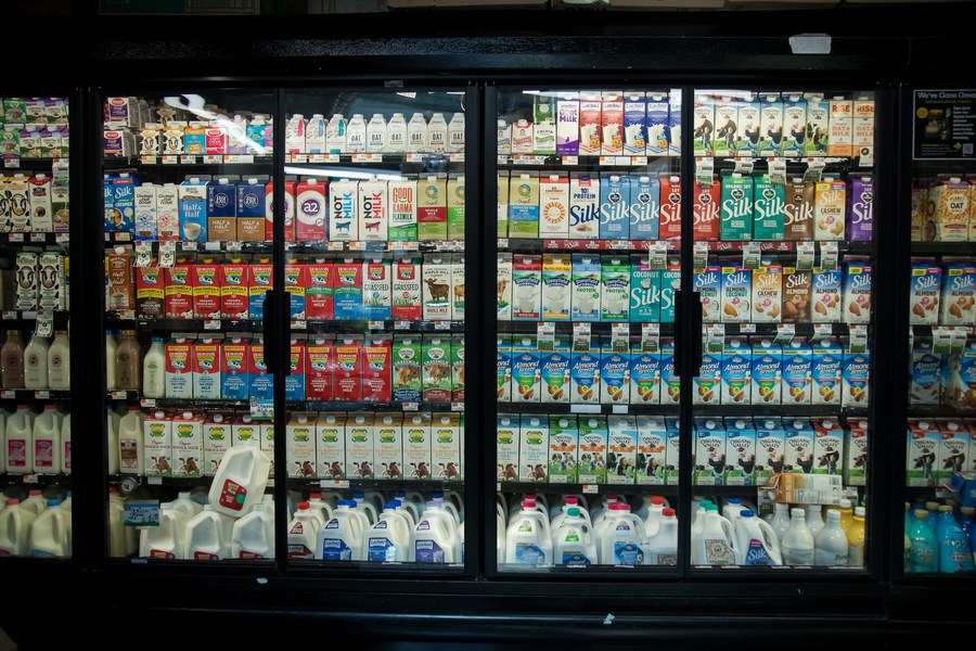 Dairy products are displayed at a grocery store in the Brooklyn borough of New York, the United States, on June 10, 2022. (Photo by Michael Nagle/Xinhua)