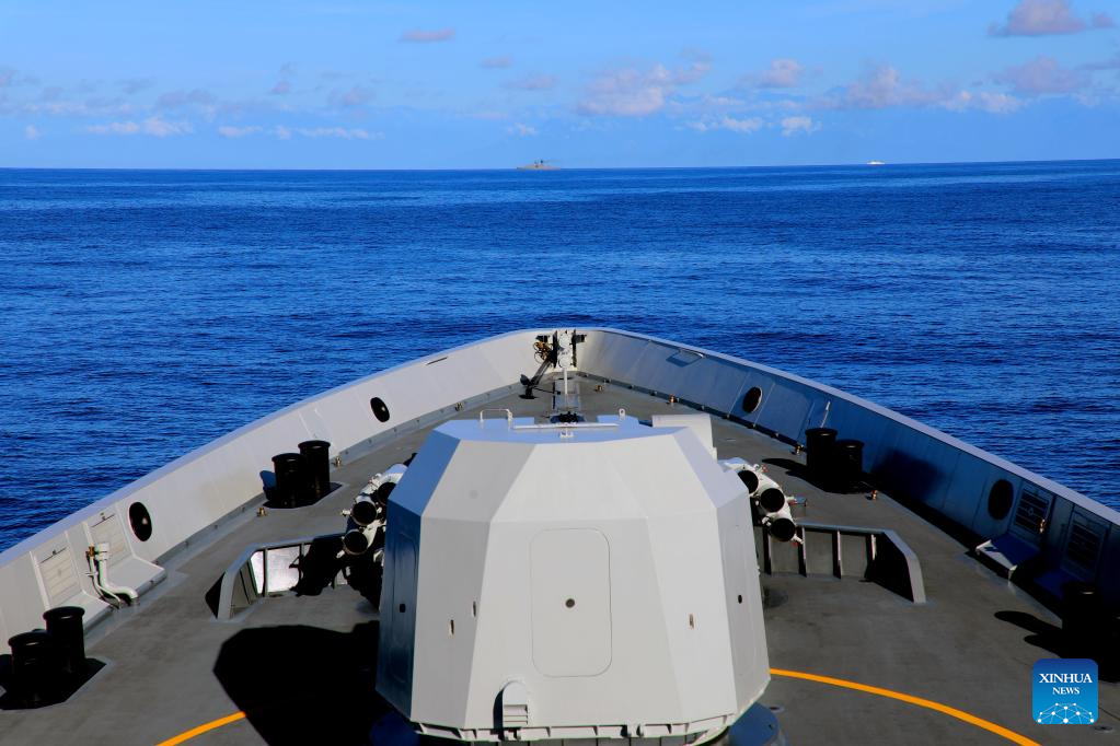 A warship of the navy of the Eastern Theater Command of the Chinese People's Liberation Army (PLA) conducts operations during joint combat exercises and training around the Taiwan Island, Aug. 6, 2022. The Command continued its joint combat exercises and training as scheduled on Saturday in the waters and airspace around the Taiwan Island. The Command tested its capabilities for striking targets on land and sea with the support of an integrated military system. (Photo by Lin Jian/Xinhua)