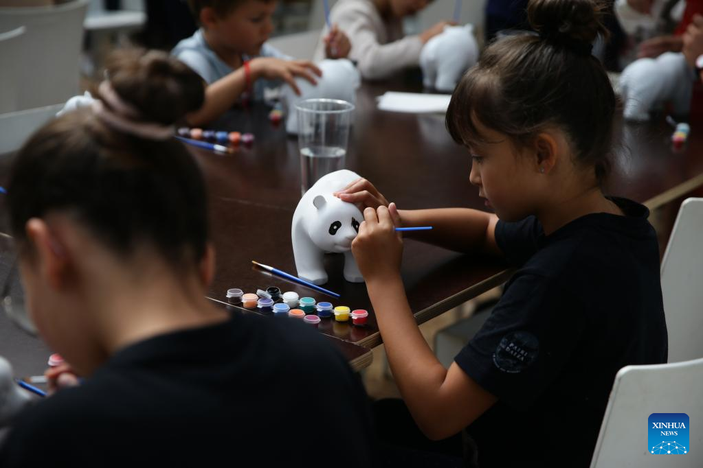 A child colors a giant panda doll during a celebration activity of the third birthday of the panda twins Bao Di and Bao Mei at the Pairi Daiza zoo in Brugelette, Belgium, Aug. 6, 2022. The celebration of the third birthday of the panda twins Bao Di and Bao Mei, born on Aug. 8, 2019 to Hao Hao and Xing Hui, was held at the Pairi Daiza zoo on Saturday. (Xinhua/Zheng Huansong)