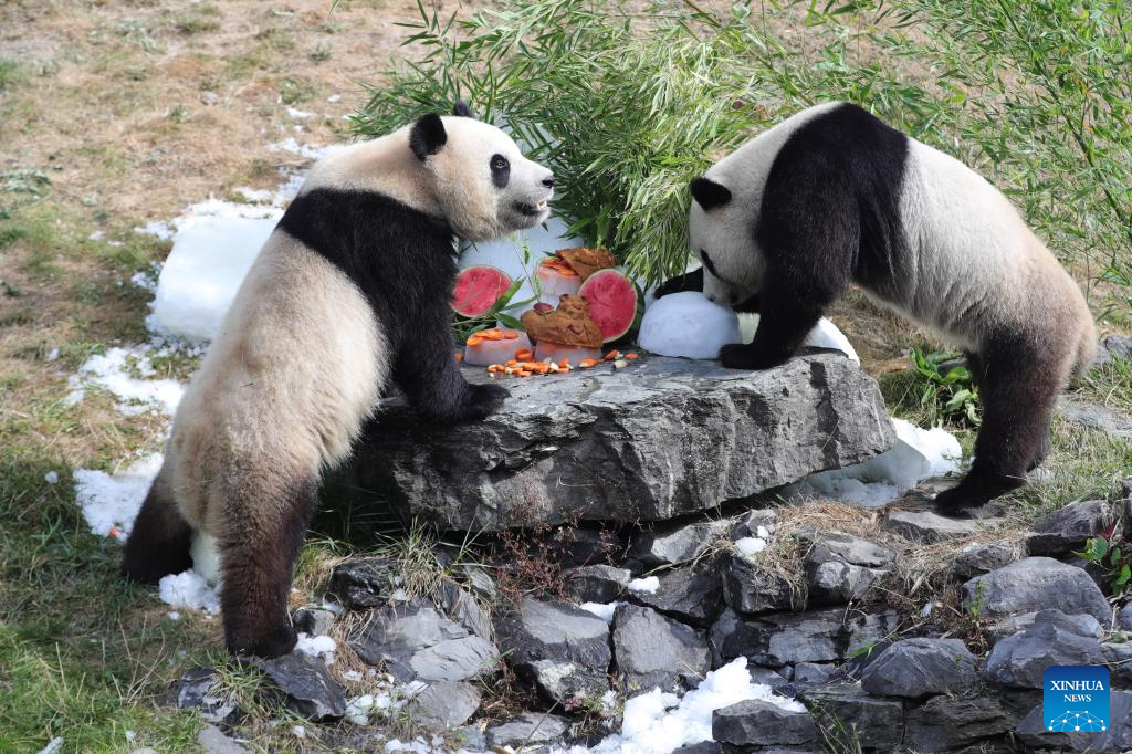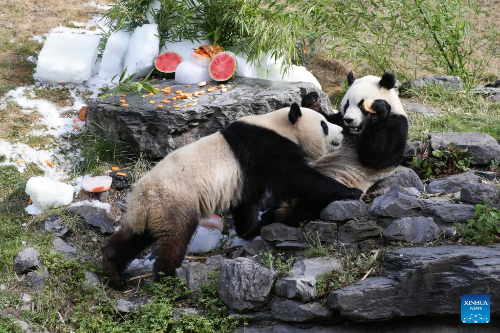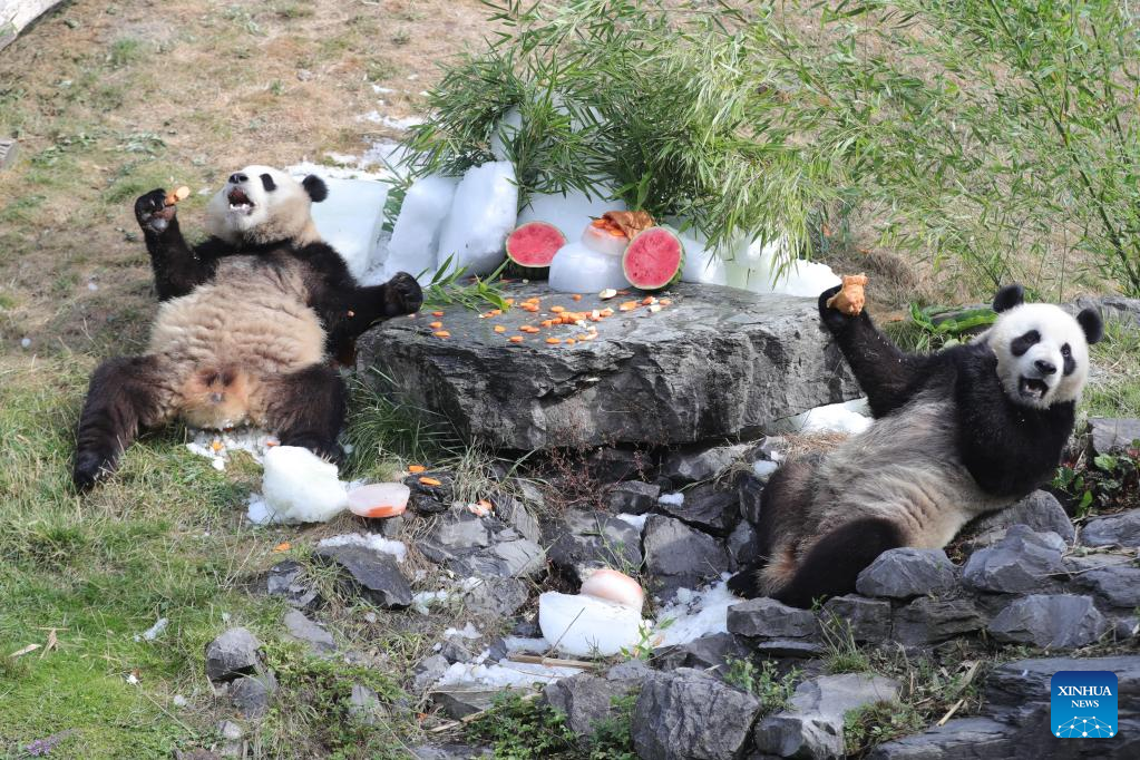 Giant panda twins "Bao Di" (L) and "Bao Mei" have birthday meal at the Pairi Daiza zoo in Brugelette, Belgium, Aug. 6, 2022. The celebration of the third birthday of the panda twins Bao Di and Bao Mei, born on Aug. 8, 2019 to Hao Hao and Xing Hui, was held at the Pairi Daiza zoo on Saturday. (Xinhua/Zheng Huansong)