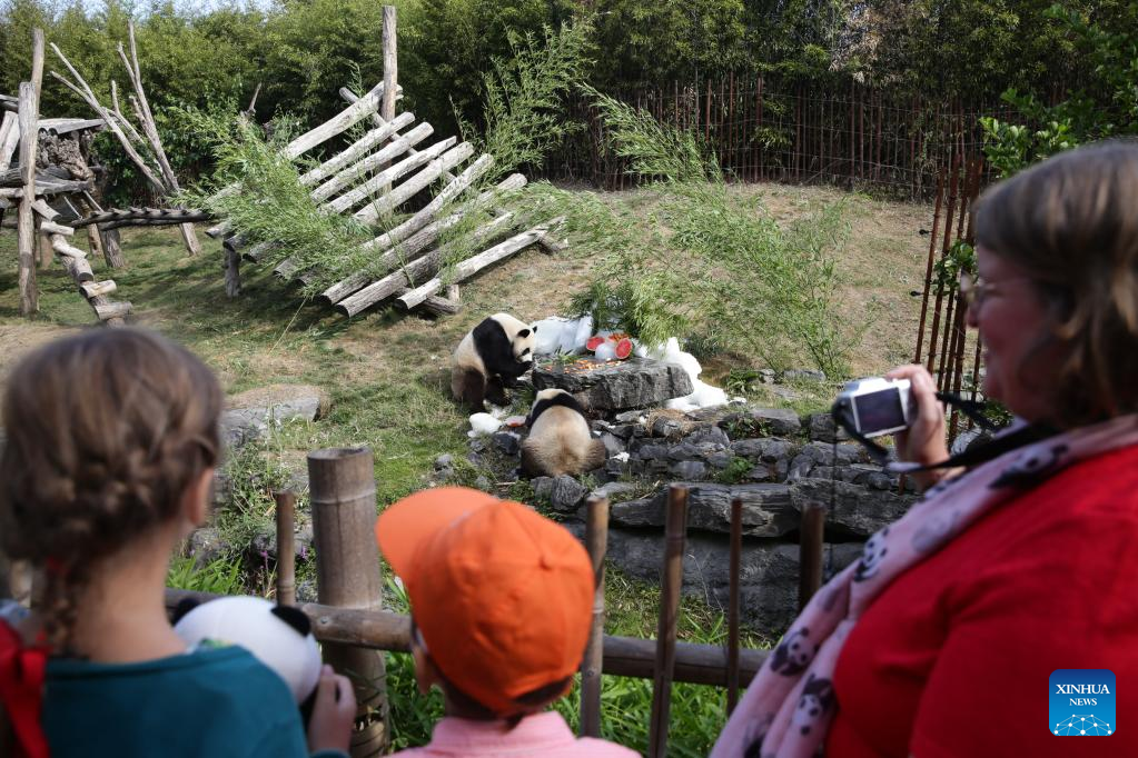 Visitors watch giant panda twins "Bao Di" (L) and "Bao Mei" having birthday meal at the Pairi Daiza zoo in Brugelette, Belgium, Aug. 6, 2022. The celebration of the third birthday of the panda twins Bao Di and Bao Mei, born on Aug. 8, 2019 to Hao Hao and Xing Hui, was held at the Pairi Daiza zoo on Saturday. (Xinhua/Zheng Huansong)
