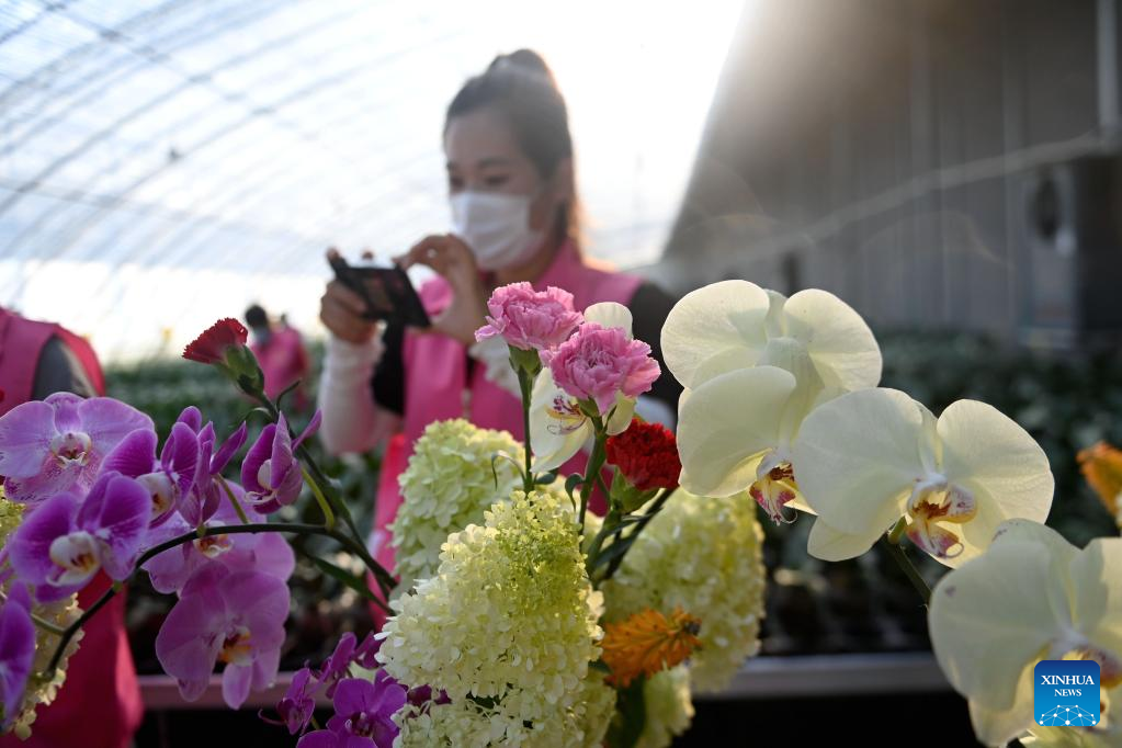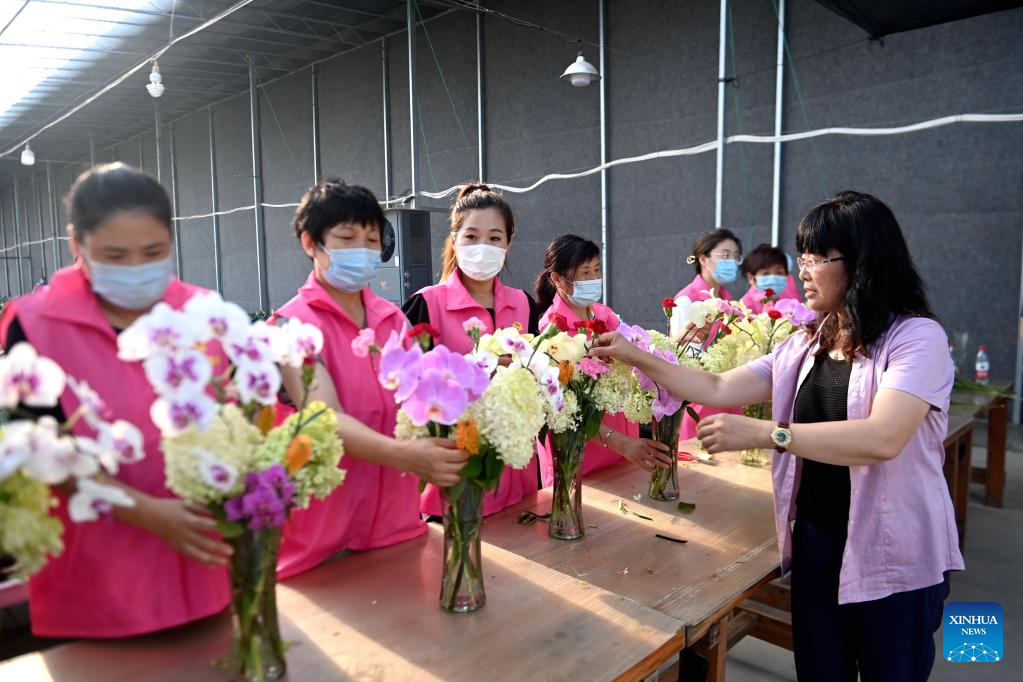 A technician (1st R) instructs villagers on flower arrangement creations in Xizaozi Village of Donggang District, Rizhao, east China's Shandong Province, Aug. 4, 2022. (Xinhua/Fan Changguo)
