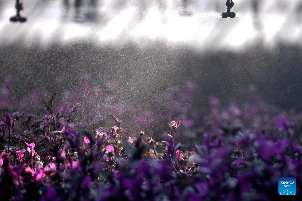 A sprinkling system waters flowers in Xizaozi Village of Donggang District, Rizhao, east China's Shandong Province, Aug. 4, 2022. (Xinhua/Fan Changguo)