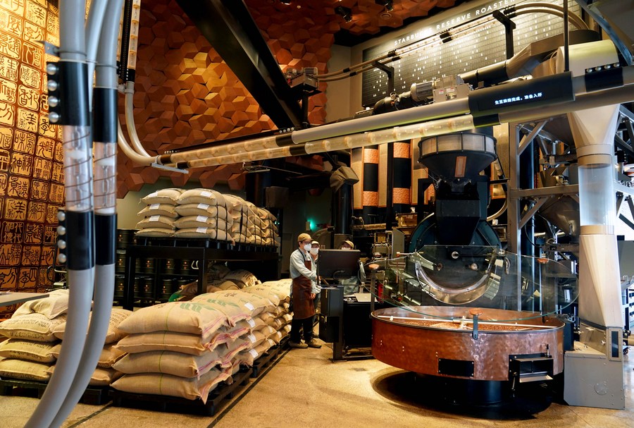Staff members work at the Starbucks Reserve Roastery in Shanghai, east China, June 3, 2022. (Xinhua/Liu Ying)