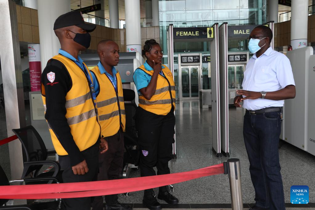 Mombasa Terminus station master Cosmas Makewa (R) talks to security inspectors at the station in Mombasa, Kenya, July 27, 2022. Launched on May 31, 2017, the 480 km Mombasa-Nairobi Standard Gauge Railway (SGR), financed mainly by China and constructed by China Road and Bridge Corporation (CRBC), has fostered job creation for local people.