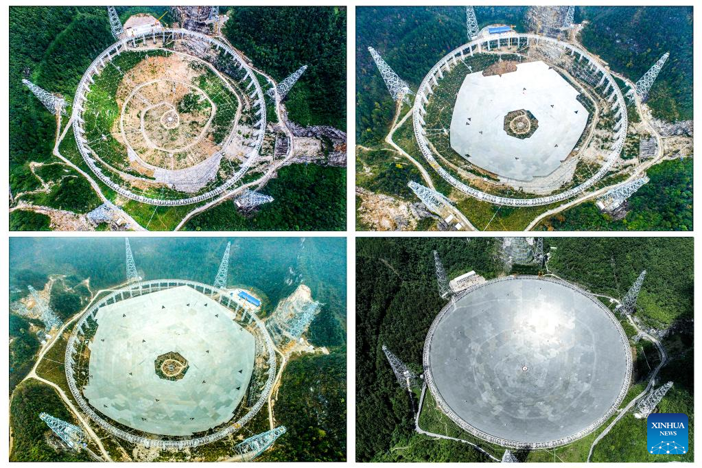 Combo photo shows China's Five-hundred-meter Aperture Spherical Radio Telescope (FAST) with the first reflection panel installed (upper L, photo taken on Aug. 2, 2015), with nearly half of the reflection panels installed (upper R, photo taken on Dec. 16, 2015), with about 80 percent of the reflection panels installed (lower L, photo taken on March 9, 2016), and a panoramic view of FAST (lower R, photo taken on July 21, 2022), in southwest China's Guizhou Province.