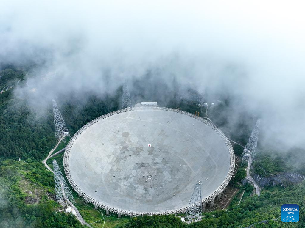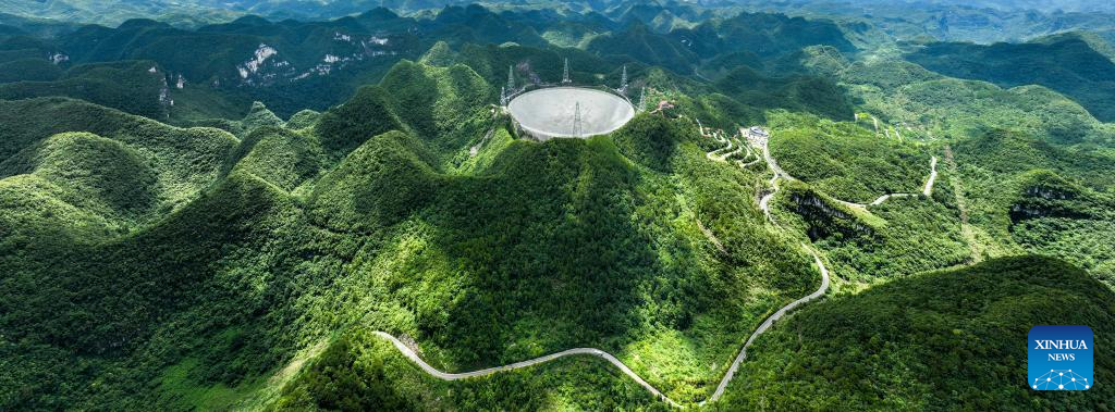 Aerial panoramic photo taken on July 21, 2022 shows China's Five-hundred-meter Aperture Spherical Radio Telescope (FAST) under maintenance in southwest China's Guizhou Province. Located in a naturally deep and round karst depression in southwest China's Guizhou Province, FAST started formal operation in January 2020 and officially opened to the world on March 31, 2021. It is believed to be the world's most sensitive radio telescope. With FAST, scientists have identified over 660 new pulsars. (Xinhua/Ou Dongqu)
