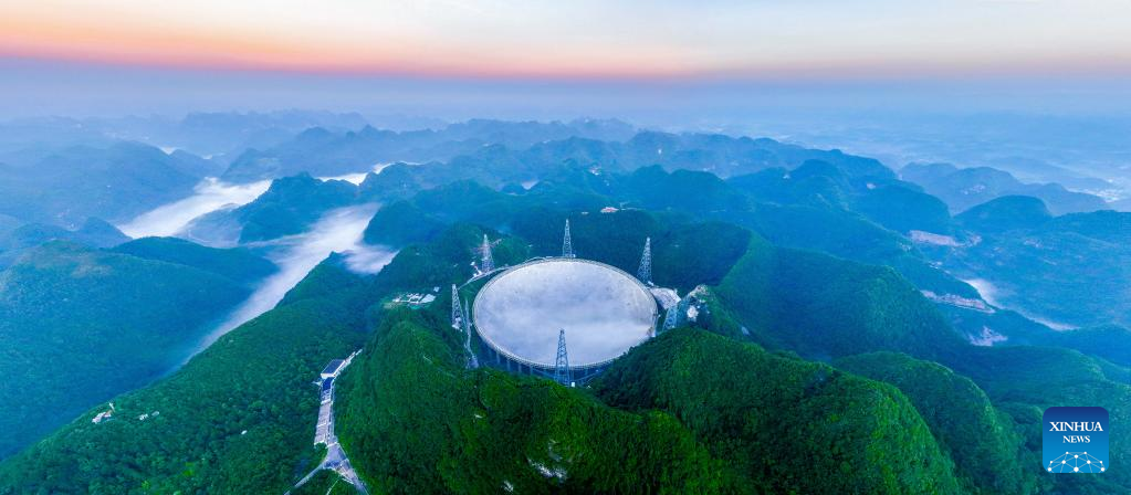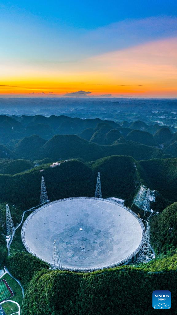 Aerial photo taken on July 21, 2022 shows China's Five-hundred-meter Aperture Spherical Radio Telescope (FAST) under maintenance at sunset in southwest China's Guizhou Province. Located in a naturally deep and round karst depression in southwest China's Guizhou Province, FAST started formal operation in January 2020 and officially opened to the world on March 31, 2021. It is believed to be the world's most sensitive radio telescope. With FAST, scientists have identified over 660 new pulsars. (Xinhua/Ou Dongqu)