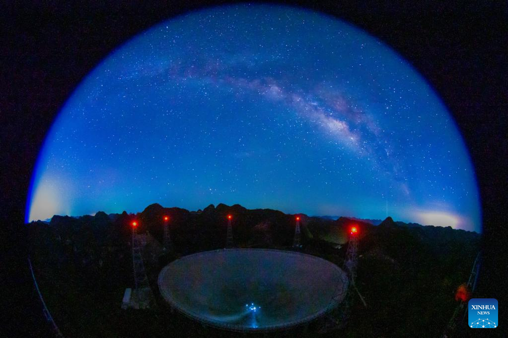 The long-time exposure photo taken with a fisheye lens on July 24, 2022 shows a night view of China's Five-hundred-meter Aperture Spherical Radio Telescope (FAST) under maintenance in southwest China's Guizhou Province.