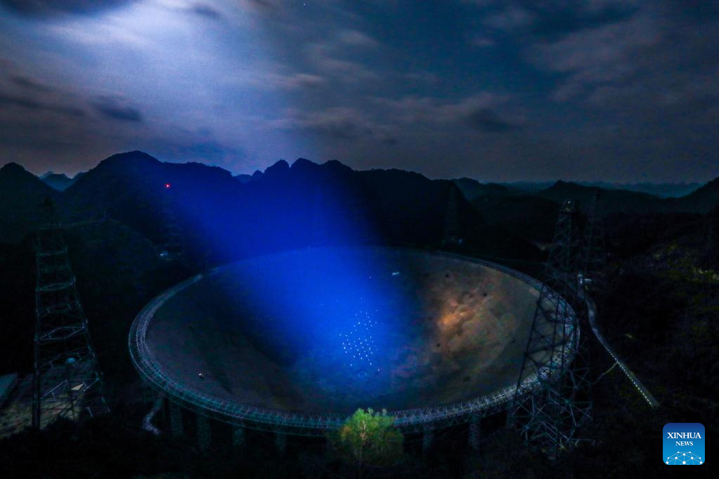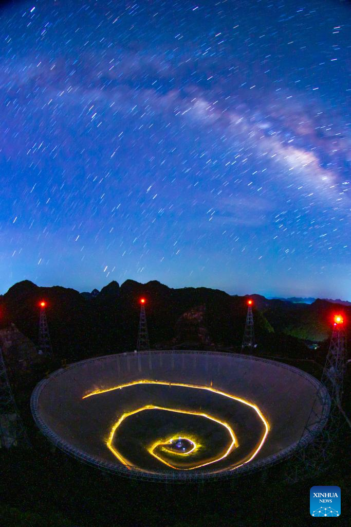 The long-time exposure photo taken on July 25, 2022 shows a night view of China's Five-hundred-meter Aperture Spherical Radio Telescope (FAST) under maintenance in southwest China's Guizhou Province.