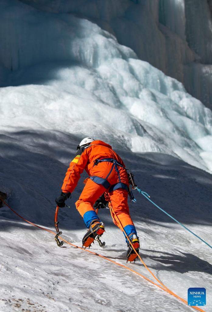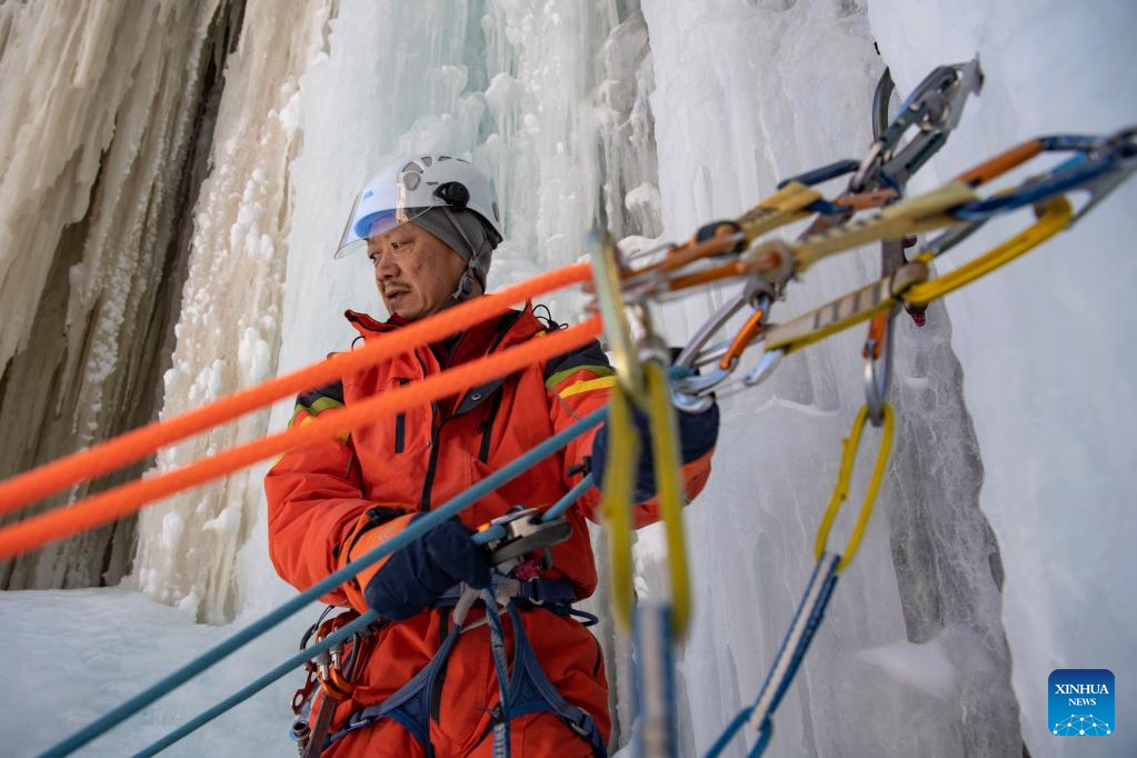 Chen Ruifeng prepares the rope system when he climbs up an icefall in southern suburb of Urumqi, northwest China's Xinjiang Uygur Autonomous Region, Jan. 12, 2021. Born in Xinjiang, 52-year-old Chen Ruifeng is a paragliding amateur. He says he feels like having his own wings when the paraglider opens. In 2016, Chen Ruifeng started to practice paragliding. Later on, he joined a local club and received his flying certificate after training. As an outdoor enthusiast, he also engages himself in trail running, mountaineering and ice climbing. In his opinions, the unique terrain of Xinjiang, such as mountains, steppes and rivers, has its own charms and thus makes here a heaven for outdoor activities. "As long as I can, I will fly higher and discover more the beauty of Xinjiang," Chen says. (Xinhua/Hu Huhu)