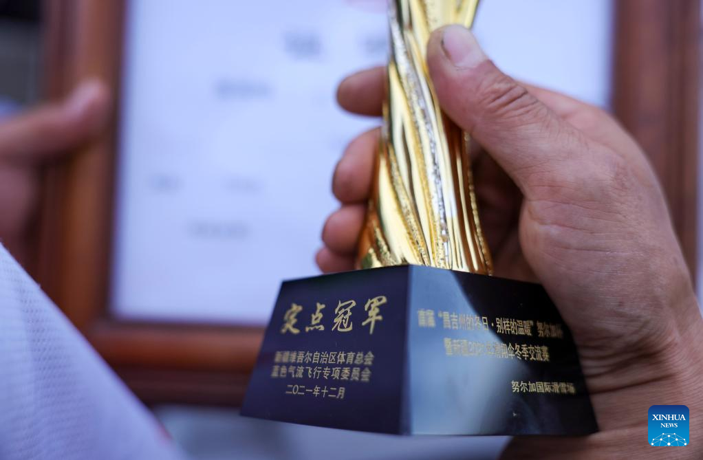Photo taken on June 14, 2022 shows a trophy for paragliding awarded for Chen Ruifeng. Born in Xinjiang, 52-year-old Chen Ruifeng is a paragliding amateur. He says he feels like having his own wings when the paraglider opens. In 2016, Chen Ruifeng started to practice paragliding. Later on, he joined a local club and received his flying certificate after training. As an outdoor enthusiast, he also engages himself in trail running, mountaineering and ice climbing. In his opinions, the unique terrain of Xinjiang, such as mountains, steppes and rivers, has its own charms and thus makes here a heaven for outdoor activities. "As long as I can, I will fly higher and discover more the beauty of Xinjiang," Chen says. (Xinhua/Hu Huhu)
