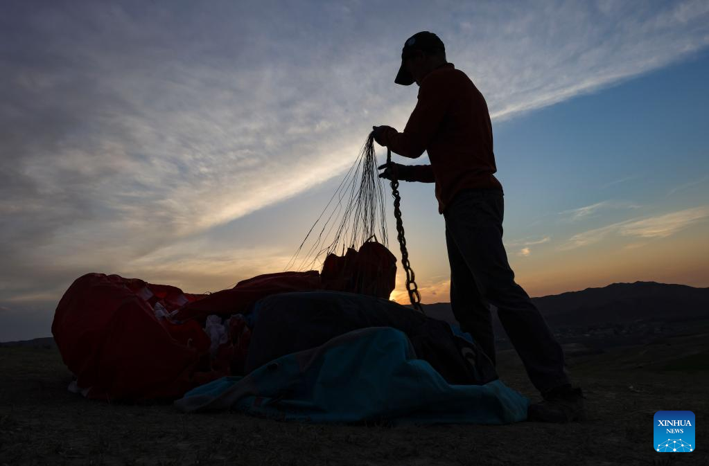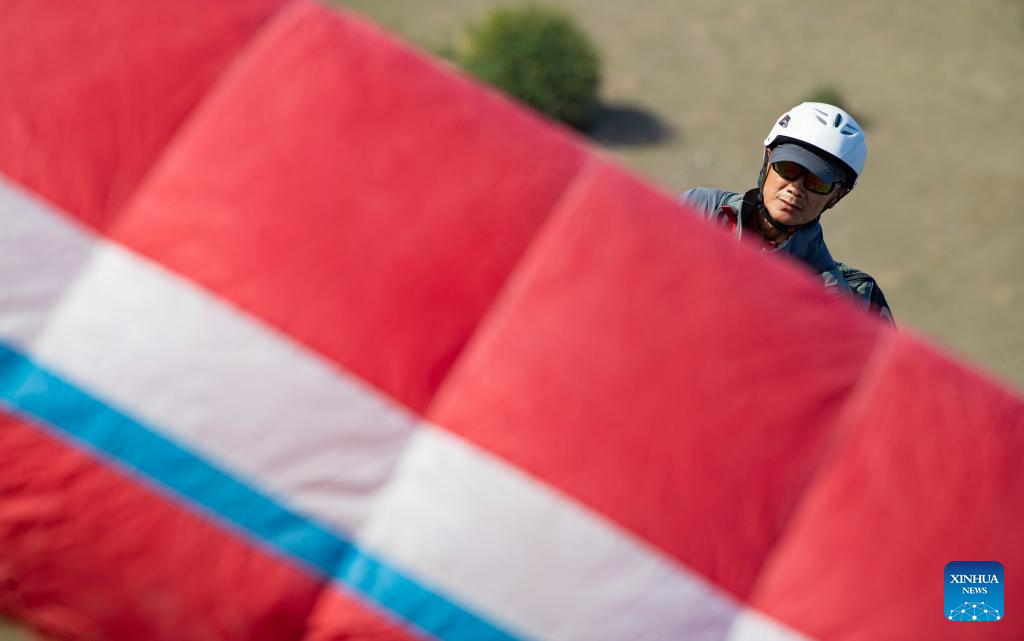 Chen Ruifeng sets up a wind sock before taking off in Jimsar County, northwest China's Xinjiang Uygur Autonomous Region, May 21, 2022. Born in Xinjiang, 52-year-old Chen Ruifeng is a paragliding amateur. He says he feels like having his own wings when the paraglider opens. In 2016, Chen Ruifeng started to practice paragliding. Later on, he joined a local club and received his flying certificate after training. As an outdoor enthusiast, he also engages himself in trail running, mountaineering and ice climbing. In his opinions, the unique terrain of Xinjiang, such as mountains, steppes and rivers, has its own charms and thus makes here a heaven for outdoor activities. "As long as I can, I will fly higher and discover more the beauty of Xinjiang," Chen says. (Xinhua/Hu Huhu)