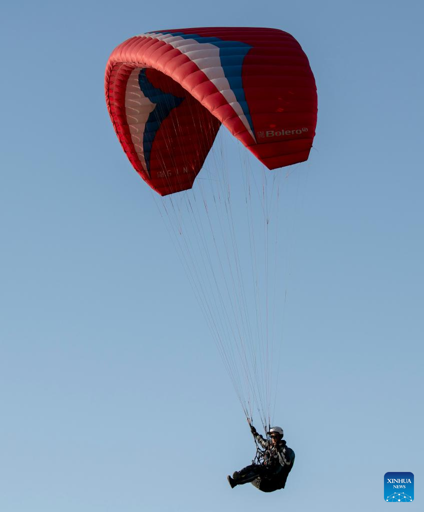 Chen Ruifeng glides in the sky in Jimsar County, northwest China's Xinjiang Uygur Autonomous Region, May 21, 2022. Born in Xinjiang, 52-year-old Chen Ruifeng is a paragliding amateur. He says he feels like having his own wings when the paraglider opens. In 2016, Chen Ruifeng started to practice paragliding. Later on, he joined a local club and received his flying certificate after training. As an outdoor enthusiast, he also engages himself in trail running, mountaineering and ice climbing. In his opinions, the unique terrain of Xinjiang, such as mountains, steppes and rivers, has its own charms and thus makes here a heaven for outdoor activities. "As long as I can, I will fly higher and discover more the beauty of Xinjiang," Chen says. (Xinhua/Hu Huhu)