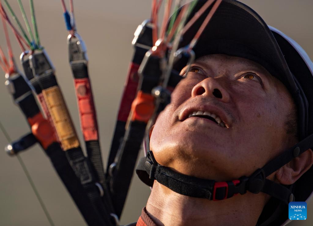 Chen Ruifeng practices paragliding in southern suburb of Urumqi, northwest China's Xinjiang Uygur Autonomous Region, May 24, 2022. Born in Xinjiang, 52-year-old Chen Ruifeng is a paragliding amateur. He says he feels like having his own wings when the paraglider opens. In 2016, Chen Ruifeng started to practice paragliding. Later on, he joined a local club and received his flying certificate after training. As an outdoor enthusiast, he also engages himself in trail running, mountaineering and ice climbing. In his opinions, the unique terrain of Xinjiang, such as mountains, steppes and rivers, has its own charms and thus makes here a heaven for outdoor activities. "As long as I can, I will fly higher and discover more the beauty of Xinjiang," Chen says. (Xinhua/Hu Huhu)
