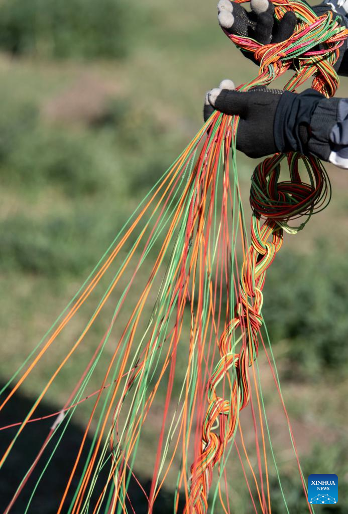 Chen Ruifeng arranges his paraglider lines in Jimsar County, northwest China's Xinjiang Uygur Autonomous Region, May 21, 2022. Born in Xinjiang, 52-year-old Chen Ruifeng is a paragliding amateur. He says he feels like having his own wings when the paraglider opens. In 2016, Chen Ruifeng started to practice paragliding. Later on, he joined a local club and received his flying certificate after training. As an outdoor enthusiast, he also engages himself in trail running, mountaineering and ice climbing. In his opinions, the unique terrain of Xinjiang, such as mountains, steppes and rivers, has its own charms and thus makes here a heaven for outdoor activities. "As long as I can, I will fly higher and discover more the beauty of Xinjiang," Chen says. (Xinhua/Hu Huhu)