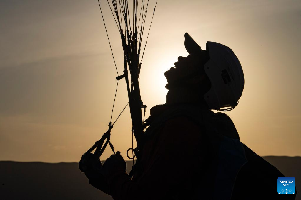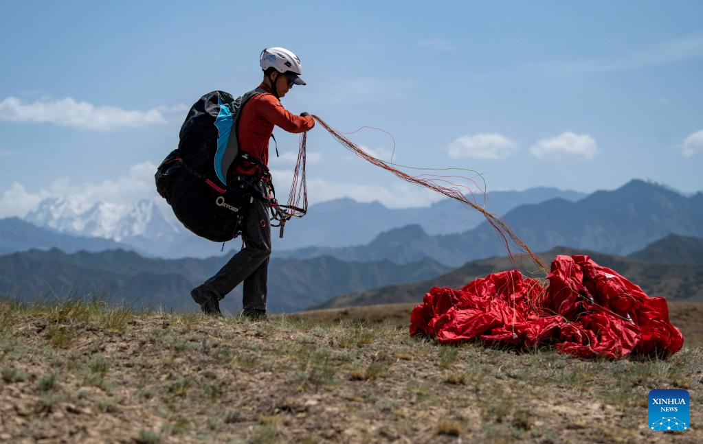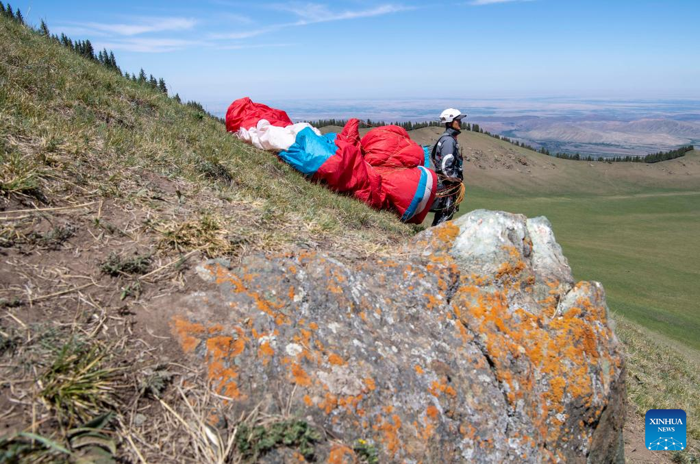 Chen Ruifeng prepares to take off in southern suburb of Urumqi, northwest China's Xinjiang Uygur Autonomous Region, May 29, 2022. Born in Xinjiang, 52-year-old Chen Ruifeng is a paragliding amateur. He says he feels like having his own wings when the paraglider opens. In 2016, Chen Ruifeng started to practice paragliding. Later on, he joined a local club and received his flying certificate after training. As an outdoor enthusiast, he also engages himself in trail running, mountaineering and ice climbing. In his opinions, the unique terrain of Xinjiang, such as mountains, steppes and rivers, has its own charms and thus makes here a heaven for outdoor activities. "As long as I can, I will fly higher and discover more the beauty of Xinjiang," Chen says. (Xinhua/Hu Huhu)