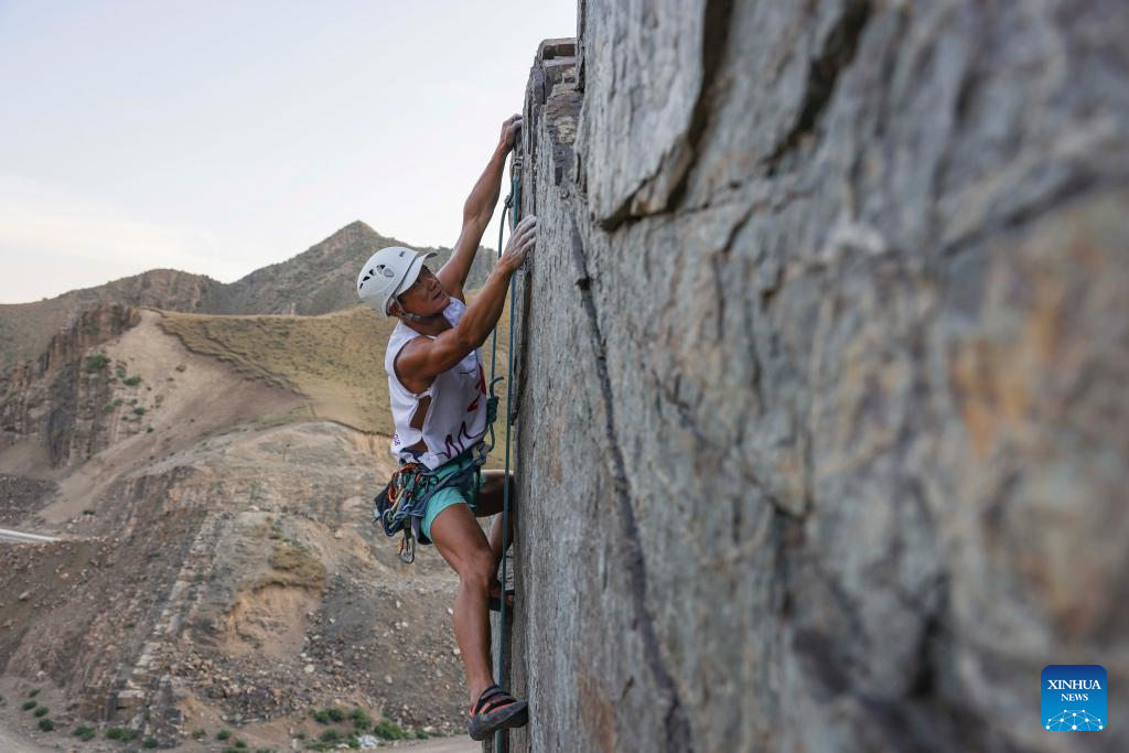 Chen Ruifeng climbs a cliff in eastern suburb of Urumqi, northwest China's Xinjiang Uygur Autonomous Region, May 30, 2022. Born in Xinjiang, 52-year-old Chen Ruifeng is a paragliding amateur. He says he feels like having his own wings when the paraglider opens. In 2016, Chen Ruifeng started to practice paragliding. Later on, he joined a local club and received his flying certificate after training. As an outdoor enthusiast, he also engages himself in trail running, mountaineering and ice climbing. In his opinions, the unique terrain of Xinjiang, such as mountains, steppes and rivers, has its own charms and thus makes here a heaven for outdoor activities. "As long as I can, I will fly higher and discover more the beauty of Xinjiang," Chen says. (Xinhua/Hu Huhu)