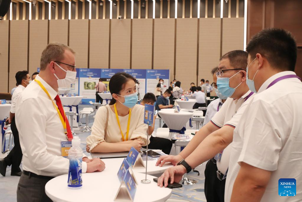 People have a discussion while attending a pre-expo supply-demand matchmaking meeting for the Intelligent Industry &Information Technology Exhibition Area of the fifth China International Import Expo (CIIE) at the National Exhibition and Convention Center (Shanghai) in east China's Shanghai, Aug. 8, 2022. (Xinhua/Fang Zhe)